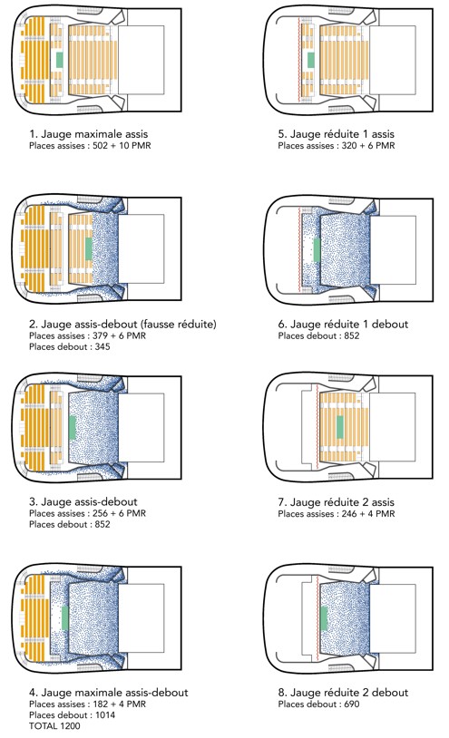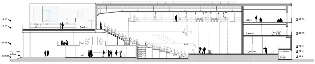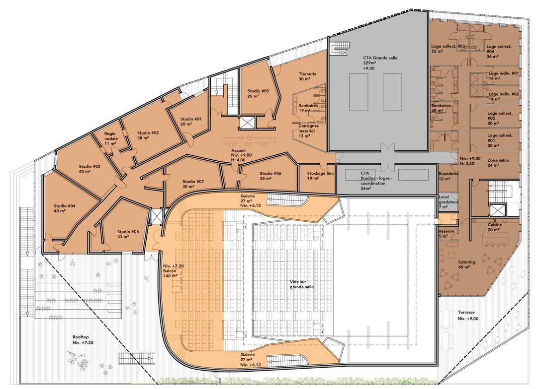 The site’s layout guided the work on the organization of the project’s different levels. On the logistics side, from the covered technical courtyard, a truck-loading dock and a common junction area provide level access to the backstage area and its various dedicated technical rooms and the two stages. On the audience side, there is direct access from the middle of the site and the large terrace, which opens onto the two halls and the stalls of the two auditoriums.