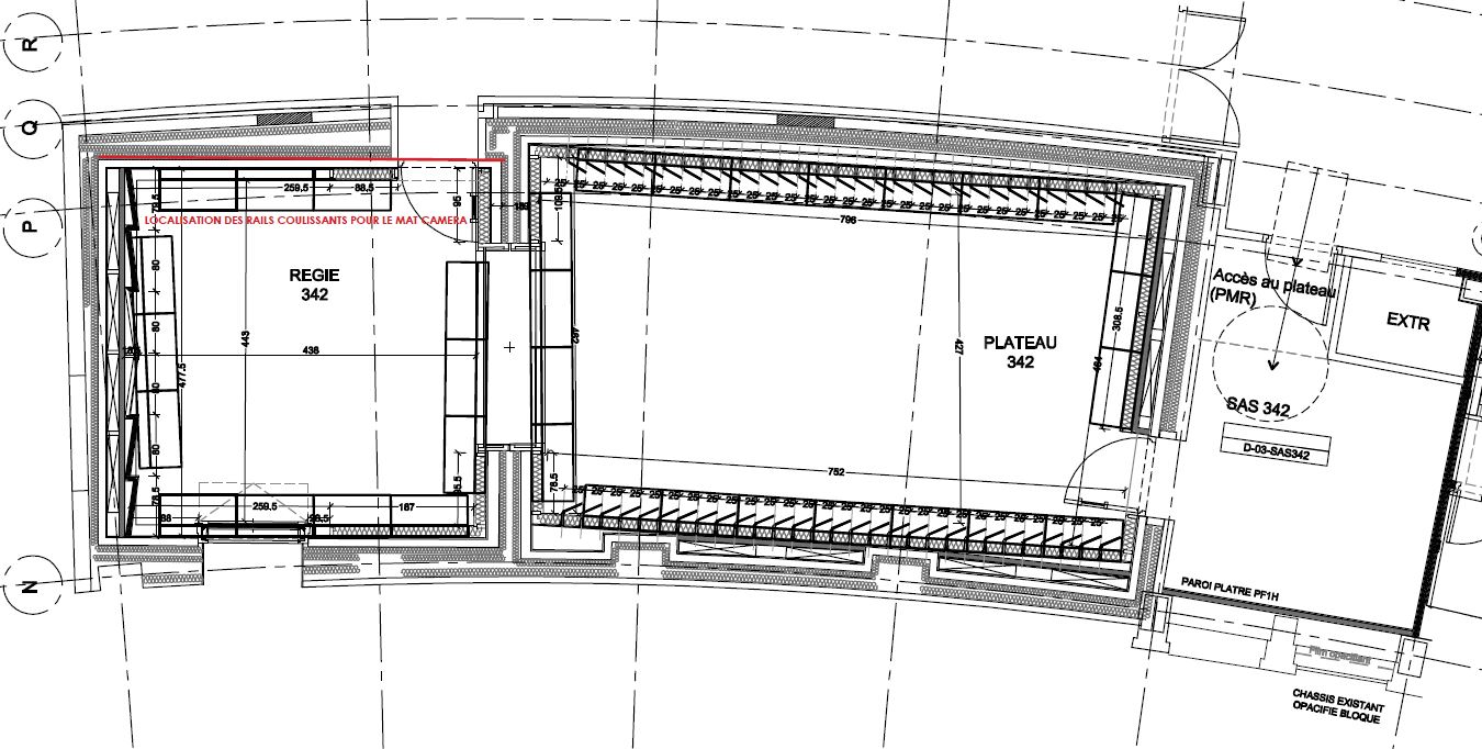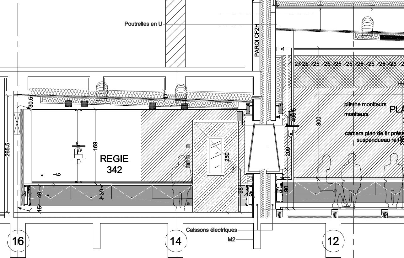 Creation of six “acoustic boxes” converted into six broadcast and recording studios. They are intended for Radio France channels, including France Inter, France Culture, and France Musique.Our mission is to assist the architect with the interior design of the studios and the design of stage equipment for video recording. Four studios are double-height, allowing them to accommodate small musical groups for live recordings. Studio 652 is structured around a set of geometric lines that create a visual anamorphosis, ideal for video recording.Studio 451 is clad in smocked felt panels, a metaphor for radio acoustic envelopment.Studio 351 is a futuristic and technical environment, combining the curves of a cyclorama with the rectilinear rigor of engineering.Studio 542 is enveloped in veils with enigmatic reliefs.Studio 551 embodies a futuristic vessel in immersive geometric lighting.Studio 342 is a luminous temple organized with technical vertical panels made of thin marble slats.These studios offer unique interior designs, harking back to the first studios of the Maison ronde.