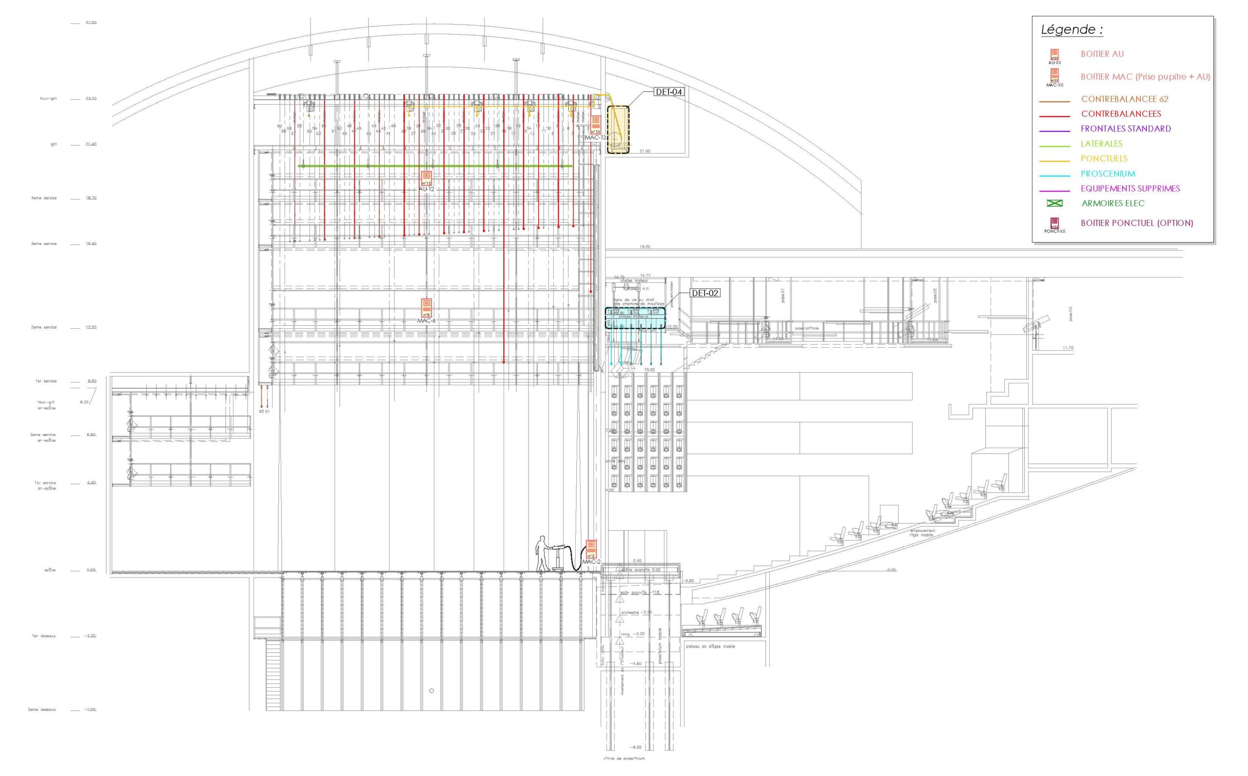 The Théâtre de la Cité, built in 1998 under the name Théâtre National de Toulouse, houses two theater auditoriums with 900 and 250 seats equipped with a combination of manual and computerized stage machinery. After more than 20 years of service, the control systems installed when the theater opened had become obsolete and were experiencing numerous malfunctions. In addition, the lifting machinery required work to bring it into compliance with machine safety standards. dUCKS scéno carried out a feasibility study for the replacement of the control systems and the compliance of the machinery, then designed and supervised the modernization of the carriers and spotlights in the two auditoriums (70 axes in total). Replacing the existing control system with a Trekwerk TNM system made the stage installation more reliable and secure and opened up new possibilities for using this beautiful creative tool. dUCKS scéno supported the theater and the city throughout the entire process, from the initial analysis to user training.