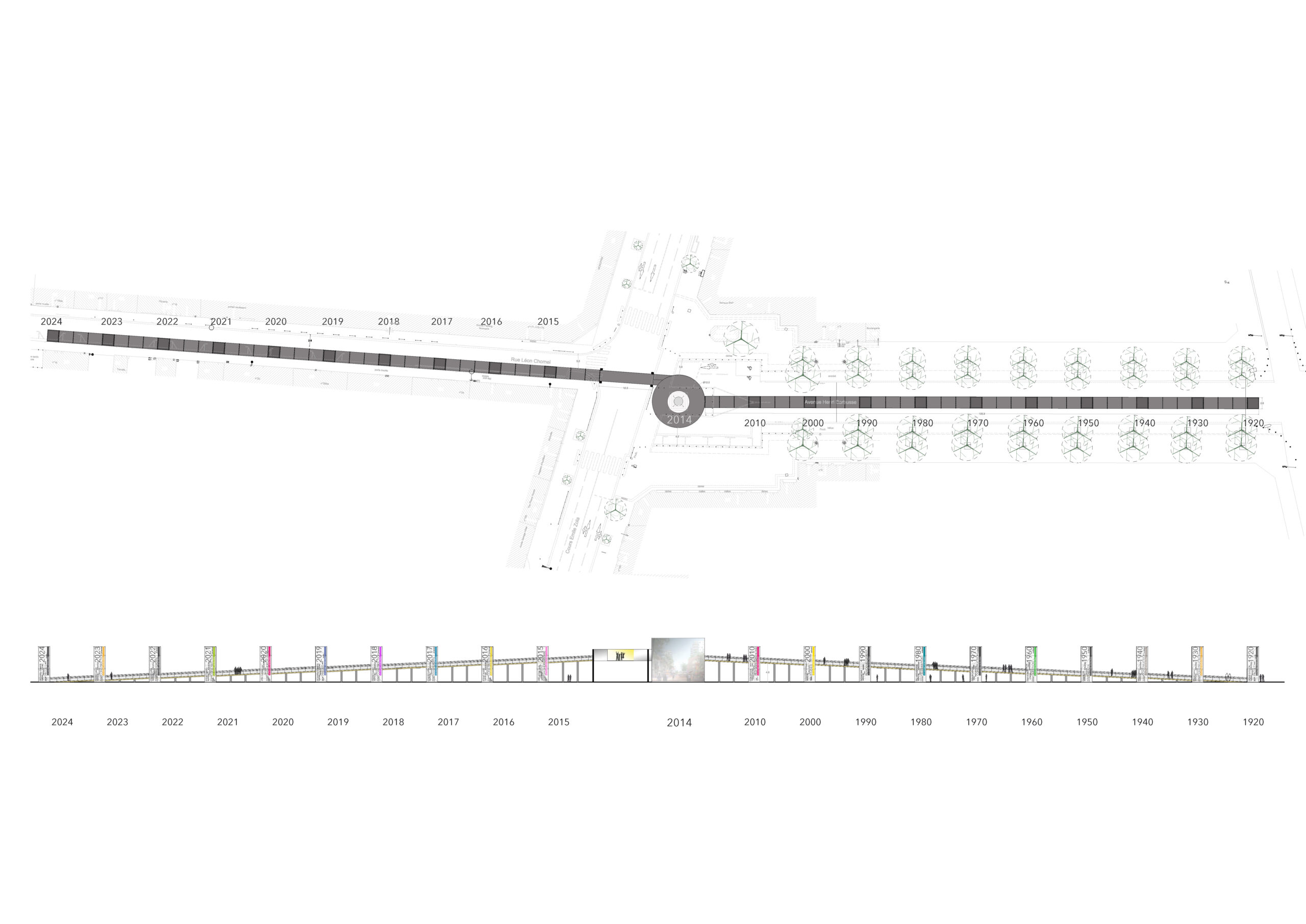 À l’occasion des 80 ans des Gratte-Ciel, une exposition temporaire prend place au coeur de la ville et invite les Villeurbannais à « traverser l’espace-temps et à franchir le seuil de leur avenir. » Cette exposition prend la forme d’une passerelle monumentale, au coeur des Gratte-Ciel, et permet aux Villeurbannais, par un franchissement « en suspension » du cours Émile Zola, de préfigurer le projet à venir : Gratte-Ciel centre-ville. C’est une déambulation à travers la mémoire, l’histoire de Villeurbanne et son avenir. Composée d’une structure en échafaudages, la passerelle accueille une exposition grand format, ponctuée de « tours temporelles » et signalétiques. L’exposition propose de plonger dans l’histoire de la construction des Gratte-Ciel dans l’avenue Henri Barbusse, et d’imaginer après avoir franchi le cours Émile Zola, la ville de demain, à travers les images des futurs projets architecturaux. À l’extérieur, la passerelle met en scène les visages des Villeurbannais d’aujourd’hui, à travers des portraits géants, photographiés par Vincent Muteau. La galerie d’exposition mesure ainsi 250 mètres de long, elle est ponctuée de 18 tours, le point culminant est à 6.25 mètres de haut au franchissement du cours Émile Zola. Le panorama des Villeurbannais, large installation sonore, synchronisée sur 12 points – qui mêle témoignages sur la vie du quartier, son projet architectural hors normes, bruitages urbains et virgules poétiques- prend place dans un cylindre habillé de miroirs et construit autour de la statue du Répit du Travailleur. Le cours Émile Zola est enjambé par un container de 12 m, dont la grande baie vitrée offre un nouveau cadrage sur la ville et une perspective inédite sur les Gratte-Ciel.