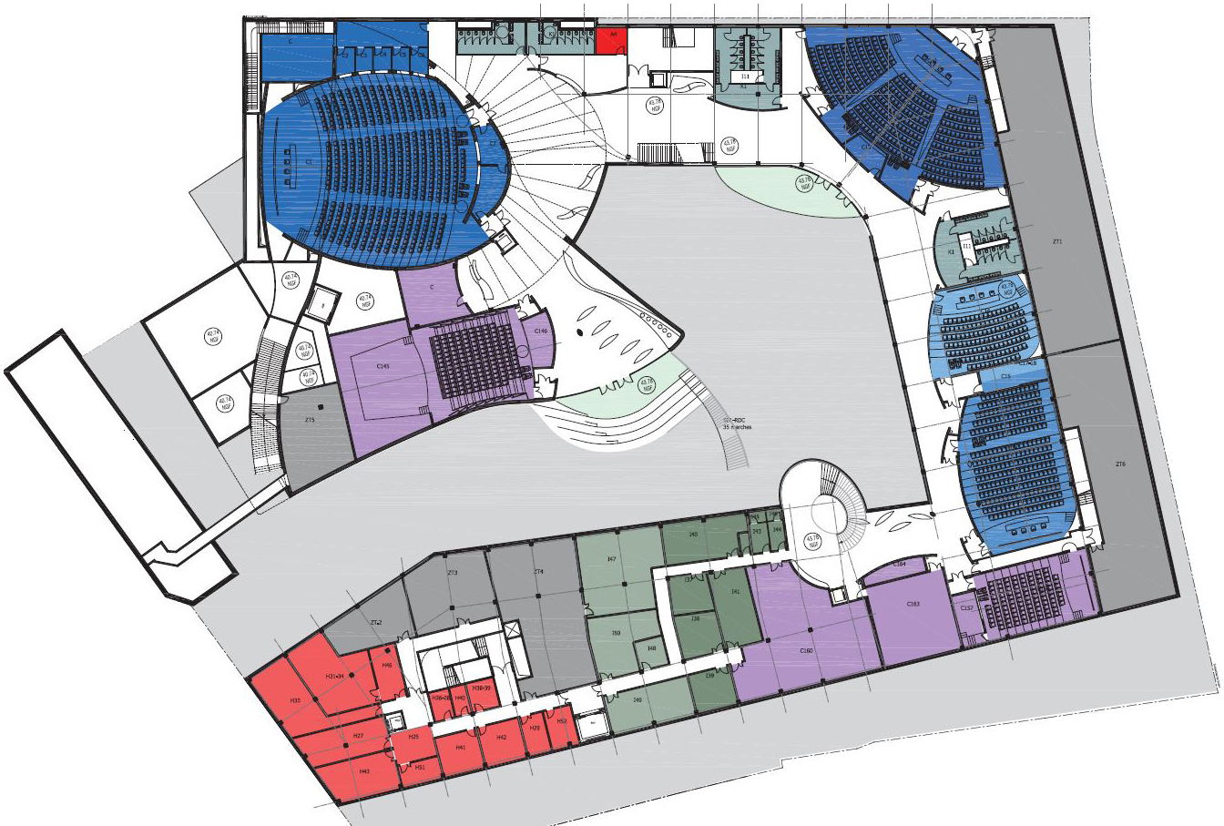 L’ensemble des salles sont innervées et connectées par des réseaux scéniques banalisés qui permettrons de véhiculer à la fois de l’audio, de la vidéo mais aussi des data. Un nodal permet de relier ces lieux mais aussi les salles de TD, les salles de visioconférence, le studio son, la salle de montage audio/vidéo, etc. et est connecté au monde extérieur au travers de liaisons haut débit.