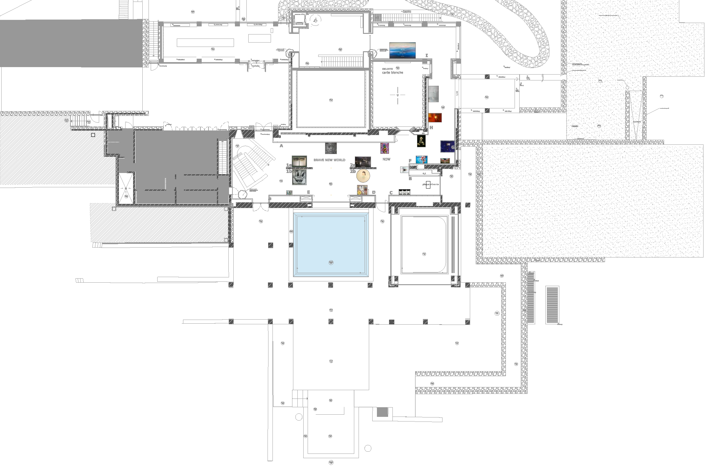 La Villa Carmignac est une rencontre entre l’art, la nature, [l’eau], la lumière et l’architecture. « Implanter un musée et un parc de sculptures sur une île aussi protégée relève à la fois du défi et du rêve.» Dès l’entrée, le visiteur plonge dans l’exposition et la collection. L’escalier conduit sous la surface, où le Ciclotrama de Janaina Mello Landini offre une expérience physique unique. Après la salle d’introduction, 100’ Fish Fountain de Bruce Nauman, génère un prélude sensoriel avec une température fraîche, une lumière brillante et le son apaisant de l’eau. La déambulation continue, l’espace souterrain se présente comme une suite de salles d’exposition dont les espaces fluides sont découpés par des cimaises (modulables et démontables), qui organisent et articulent le volume sans le cloisonner. Une trame d’inserts au sol offre la possibilité d’installer différentes configurations de cimaises selon les besoins des expositions. Le plafond d’eau au centre laisse entrer la lumière naturelle, créant un véritable «coeur scénographique». L’eau et la lumière sont des éléments scénographiques, structurant le parcours. La salle permanente Barcelo, avec ses cimaises arrondies, épouse la toile panoramique de 16 mètres et amplifie l’impression d’immersion dans cet univers marin. Les extrémités des galeries sont équipées de plafonds lumineux mimant l’éclairage naturel. L’approche scénographique est discrète, technique, s’insérant subrepticement dans l’architecture pour accompagner les oeuvres à travers la lumière et les espaces.