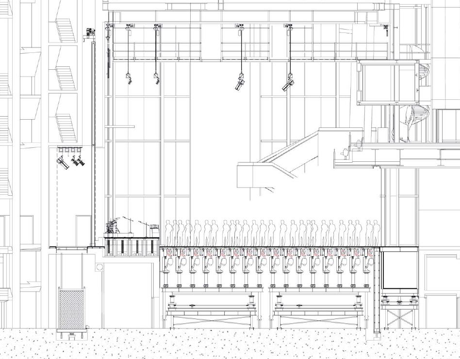 L’avant-scène est constituée de 6 élévateurs motorisés configurables pour permettre des dispositions scéniques variées. Une mini cage de scène avec quelques porteuses surplombe le plateau d’arrière scène. L’artiste Ellsworth Kelly a créé pour l’auditorium l’oeuvre « colored panels » et la toile du rideau de l’arrière-scène manoeuvré à l’allemande (Spectrum VIII). Des dispositifs de rideaux à la romaine permettent d’occulter les immenses façades vitrées pour retrouver l’obscurité nécessaire aux spectacles. L’ensemble de la machinerie scénique est piloté par un système informatisé rénové en 2023.