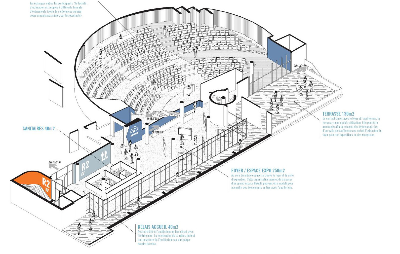 Surface bâtiment : 3435 m² / espaces Expo/Lab : 825 m² Jauge Auditorium : 398 pl. / ouverture scène : 15.5m
