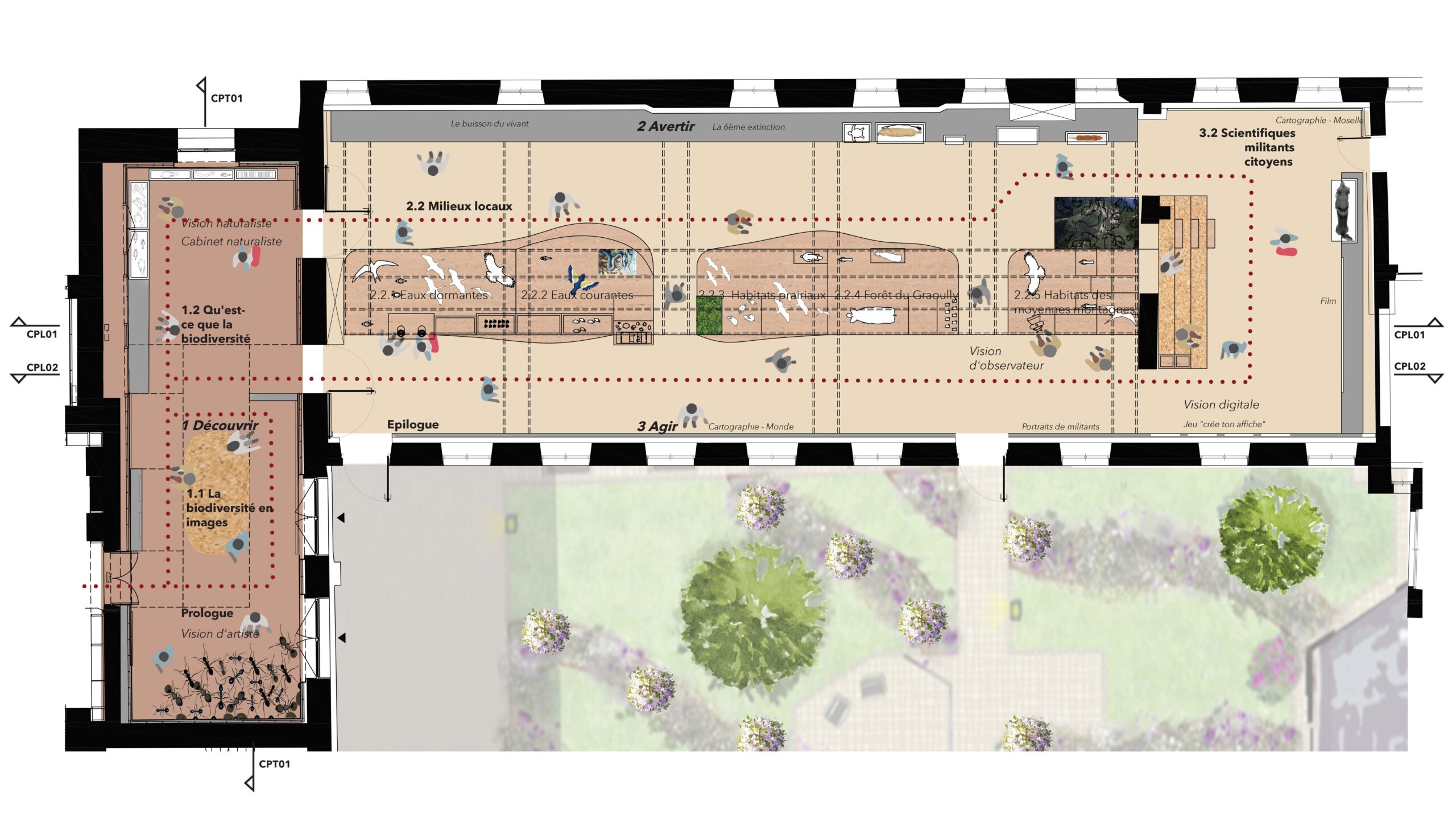 La forme étroite et linéaire des galeries et l’aller-retour inspirent une scénographie élargie qui tire parti du volume et de ses six faces pour agrandir l’espace et renforcer le sentiment d’immersion et de foisonnement. Les longs linéaires deviennent ainsi des fresques graphiques, supports continus de médiation, construisant un discours approfondi et réflexif à l’aller puis au retour. Les plafonds sont des toiles scénographiques, pour certaines animées, où les oiseaux volent, les nuages les animaux s’y installent, les miroirs démultiplient les effets et invitent à la contemplation.