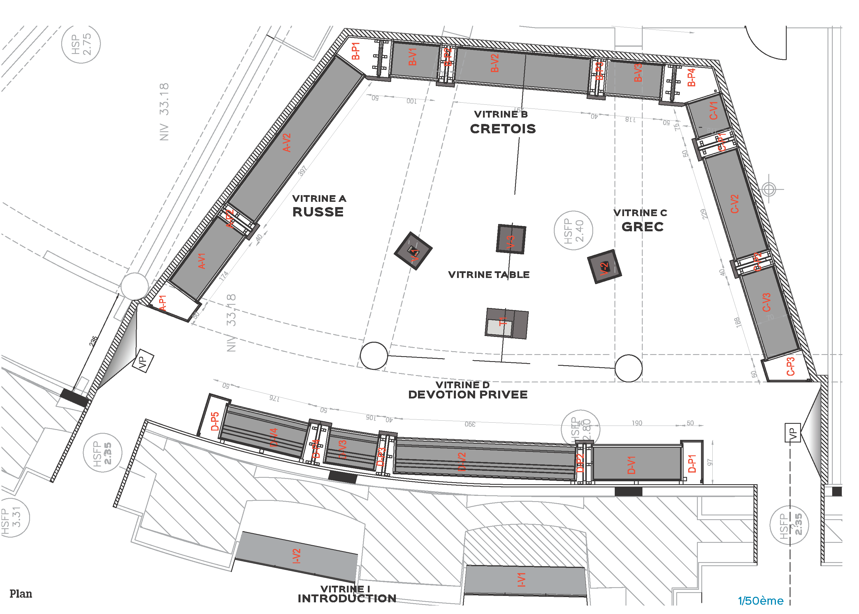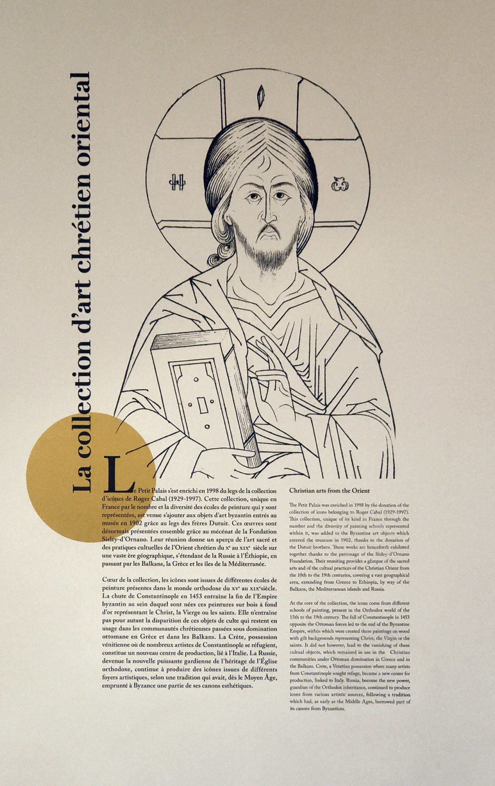 « Composé d’icônes postbyzantines et russes issues du leg de Roger Cabal, cette remarquable collection offre un large aperçu des différentes écoles qui se développèrent après la chute de l’Empire byzantin et rend compte de l’un des pans les plus importants de l’art religieux ». Ce nouvel espace, dédié à la collection d’icônes du Petit Palais, les replace dans leur contexte culturel et artistique et met en valeur leur richesse et leur qualité à travers de larges vitrines sur-mesure. La galerie d’entrée comprend deux vitrines et compositions graphiques qui annoncent la salle des icônes et introduisent l’exposition. De part et d’autre, les deux accès sont illuminés et prolongés par des projections vidéo et sonores qui invitent à entrer et à découvrir l’exposition. La mise en scène offre une vision panoramique de la collection. Trois pans de vitrines murales présentent les chefs-d’oeuvre des écoles grecque, crétoise et russe. La composition est scandée par des panneaux verticaux permettant à la fois de cacher les structures, charnières et serrures des vitrines et de servir de support à la médiation. Le dernier pan de vitrines murales dédié aux icônes « objets de culte » et « Mère de Dieu » comporte des lutrins de présentation permettant de varier aisément l’accrochage et d’offrir une plus grande densité d’oeuvres. Au centre de l’espace sont présentés des objets d’art byzantins et des monnaies en or ; une croix éthiopienne exposée sur pied dans une vitrine haute complète l’ensemble. La table multimédia, accompagnée de matériels pédagogiques illustrant les techniques de l’icône, permet de consulter les cartels développés de l’ensemble des oeuvres et de se familiariser avec les techniques de l’icône.