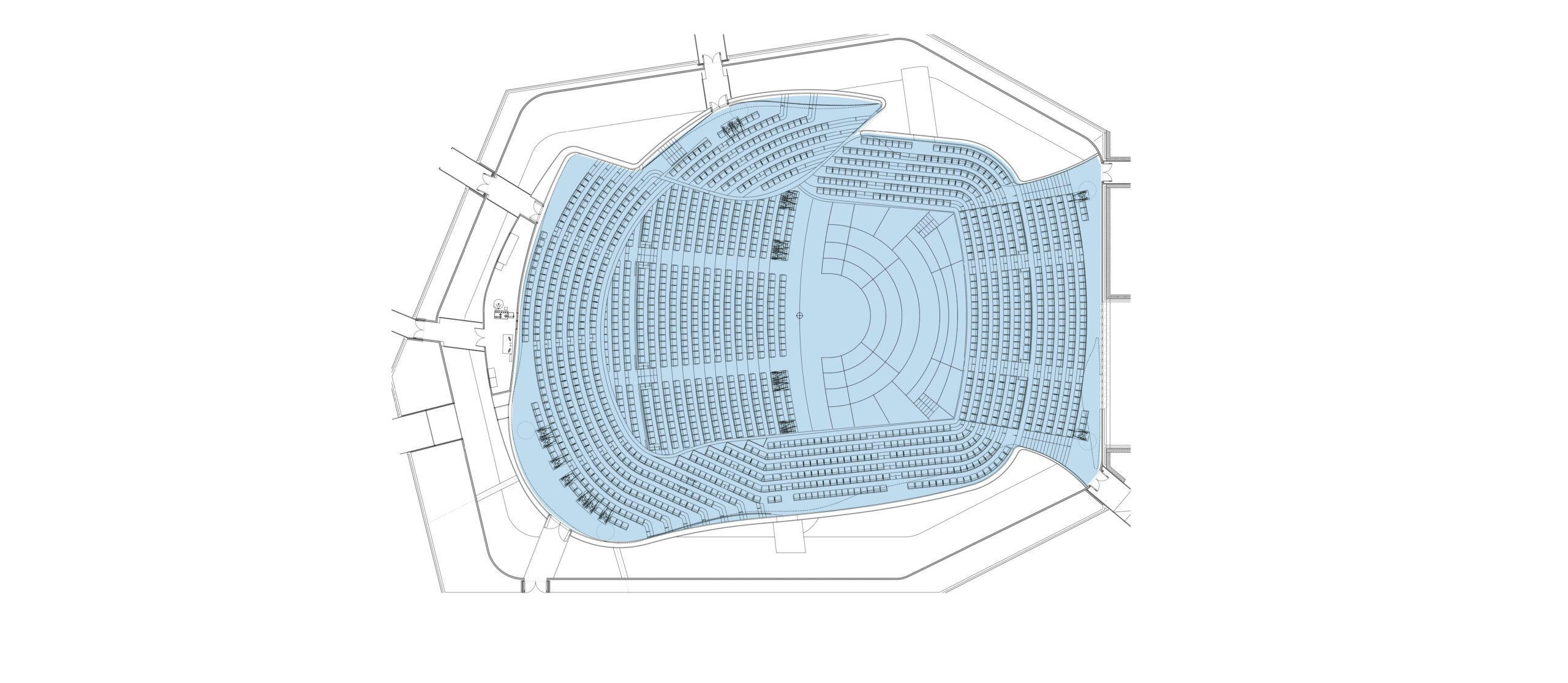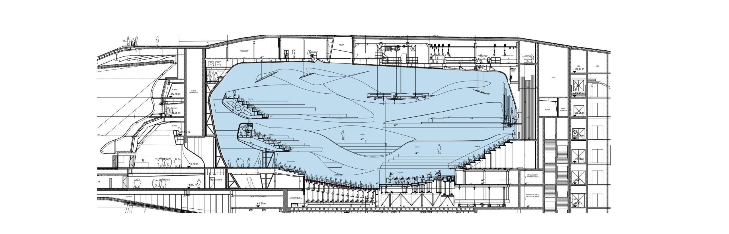 Surface bâtiment : 42 000 m² / jauge Grande salle : 2 400 assises, 3 500 assis-debout / ouverture cadre : 11.3 m / profondeur scène = 14.1 m / hauteur libre = 21m