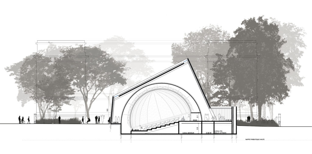 Nous avons assuré le conseil sur les questions scénographiques globales -accès, flux, réseaux, attente et entrée des visiteurs, etc.- et plus particulièrement les études de visibilités et d’implantation des assises. Nous avons étudié un dispositif dynamique comme objet signalétique sur la toiture qui n’a pas été finalement retenu.