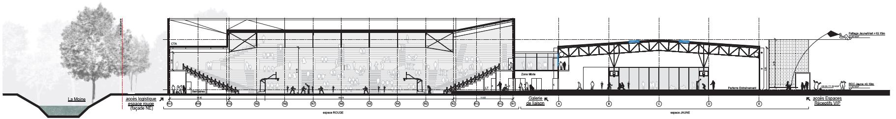 Le projet de rénovation de l’Espace rouge a pour objet de créer un nouvel ensemble de tribune fixes pour remplacer les tribunes démontables existantes et d’augmenter la jauge jusqu’à 5 000 places. Un ensemble de tribune télescopique en bord de terrain permet de moduler la jauge et la taille du terrain. La salle réhabilitée est mise à niveau pour les règles fédérales du Basket au niveau international. dUCKS scéno a pris en charge la conception du gradin, des courbes de visibilité, des dispositifs d’accroche pour le son, l’éclairage et