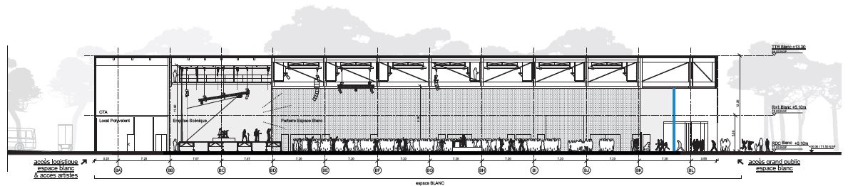 techniques pour permettre la circulation des techniciens dans la charpente. La salle est irriguée par des réseaux scéniques pour garantir une grande flexibilité d’utilisation.
