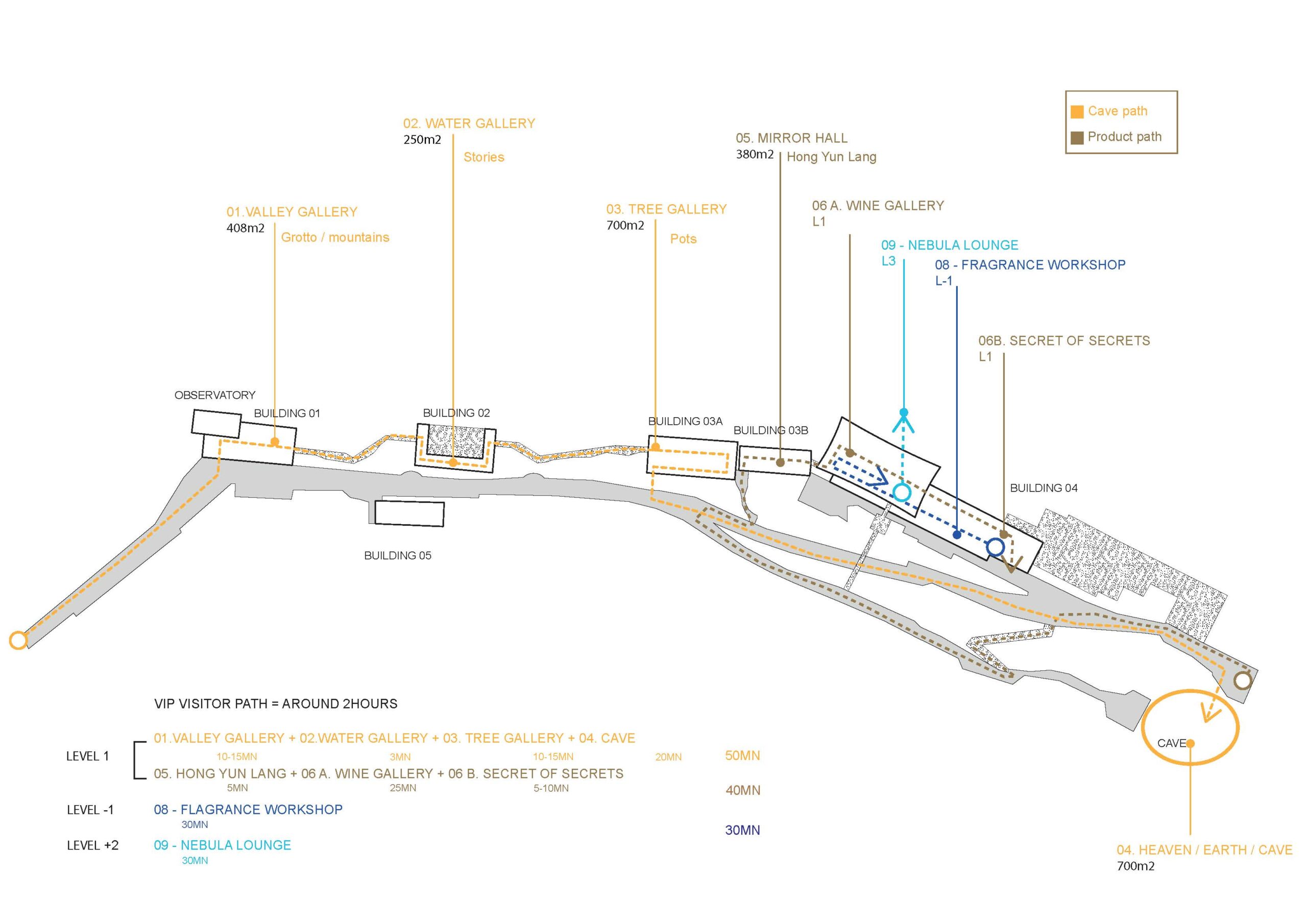 L’expérience vise à présenter la qualité des produits Langjiu à travers une découverte esthétique, onirique et scientifique. Chaque pavillon représente une étape de ce voyage, débutant par la découverte du caractère unique des grottes karstiques, suivie par des récits historiques et mythologiques, jusqu’au méthodes de stockage et de vieillissement révélant l’interaction entre la nature, les jarres et le processus de vieillissement de l’alcool. Enfin, le dernier pavillon présente des bouteilles de collection et des séries d’art mises en scène dans des environnements théâtraux et poétiques, avant de plonger dans une partie plus technique sur l’art de l’assemblage par les maîtres assembleurs. Chaque pavillon offre une scénographie et une atmosphère uniques.