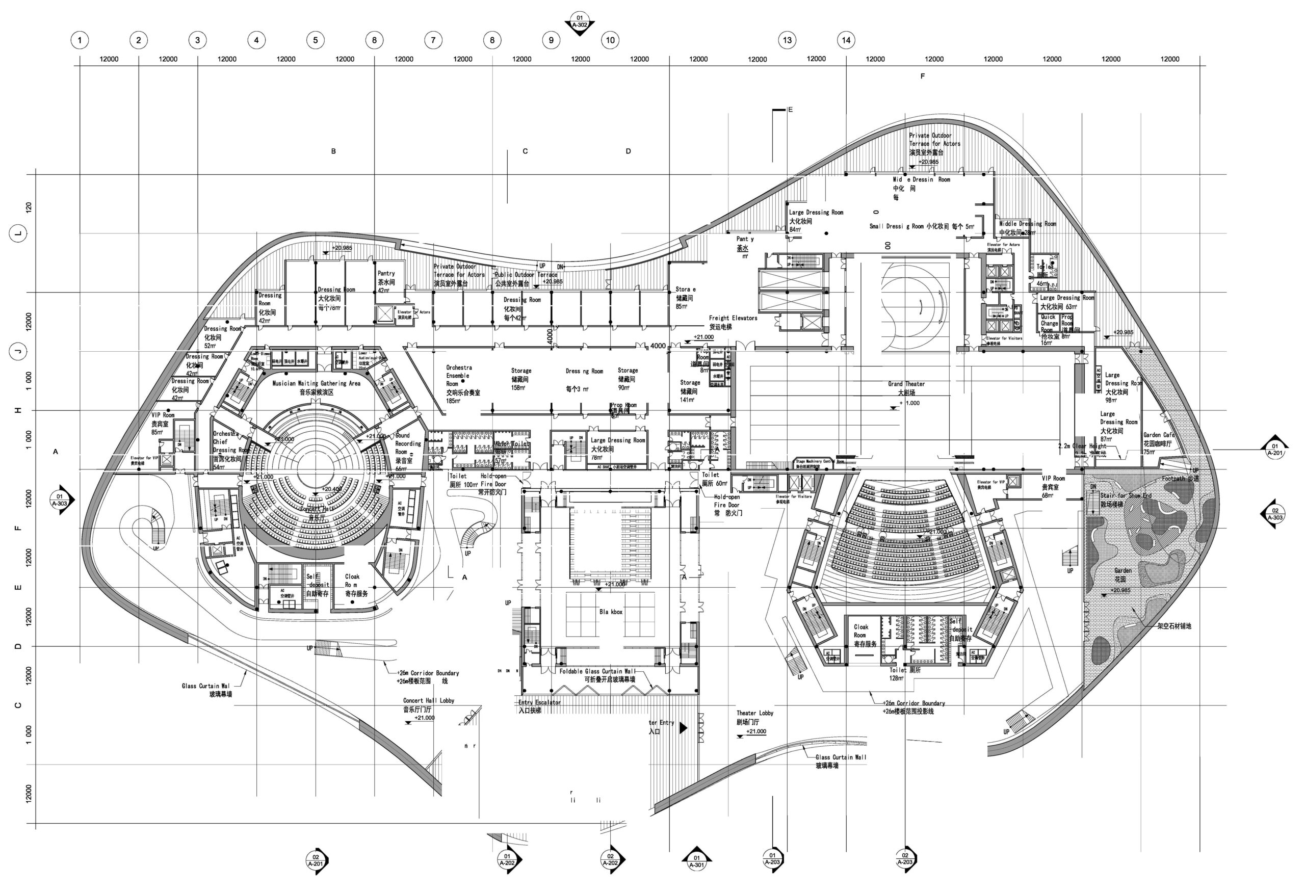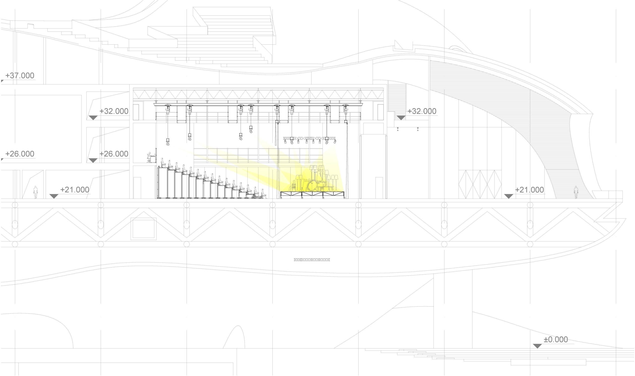 La modularité du plateau d’orchestre et des premiers rangs de l’auditoire permettent d’imaginer des configurations multiples depuis les formations de chambre jusqu’aux très grands orchestre avec un choeur important. La structure hybride de la blackbox associant poutres, passerelles et supports scéniques permet de nombreuses configurations de l’espace. Les 4 parois peuvent s’escamoter pour libérer le gradin télescopique mobile ou pour s’ouvrir directement sur le lobby d’entrée et à la vue sur la ville de Yichang, ou pour relier les foyers du grand théâtre et de la salle de concert et imaginer ce grand espace événementiel où l’ensemble du Centre pulse sur un même tempo.